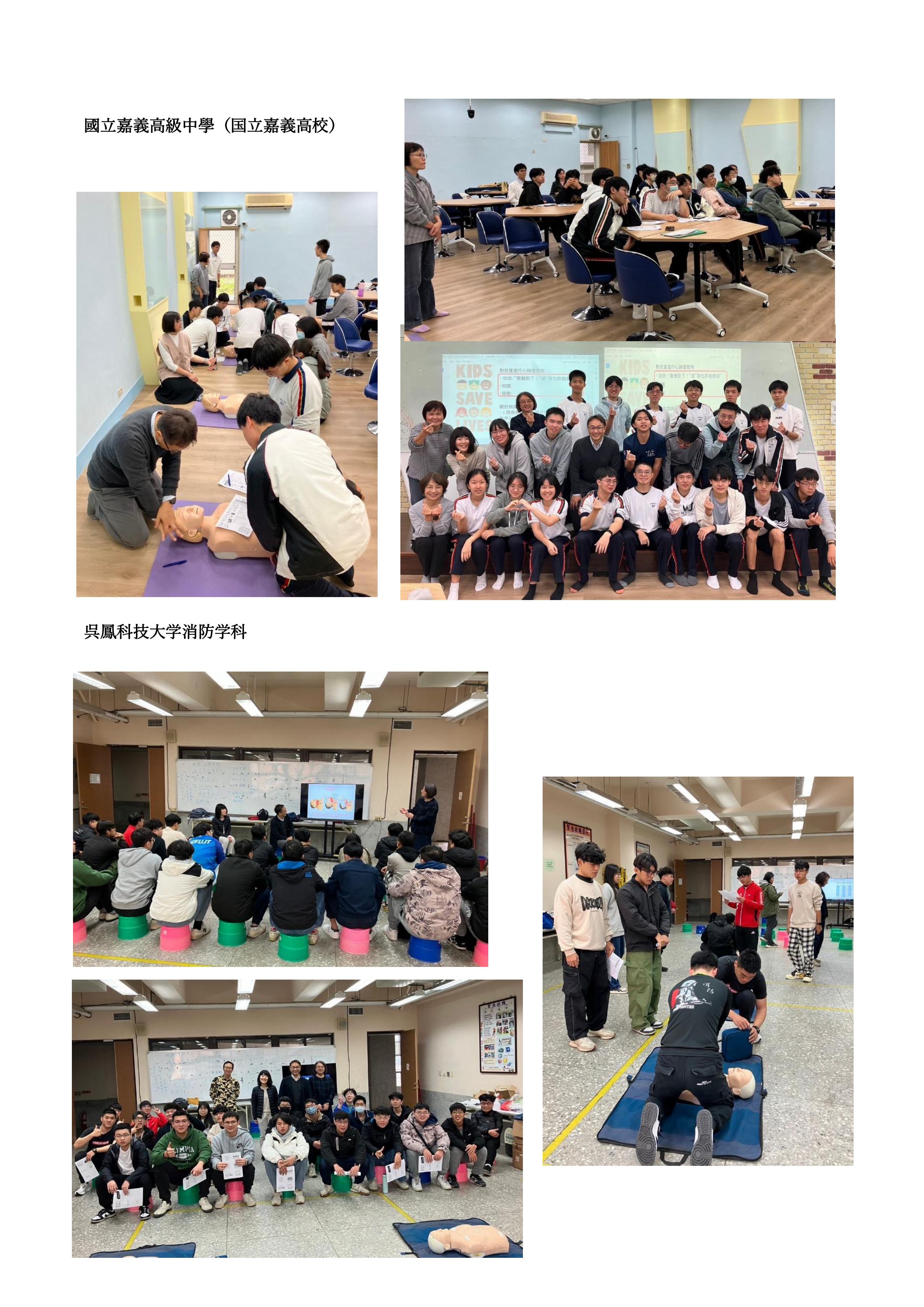 2025年2月24日(月)に台湾の國立嘉義高級中學(国立嘉義高校)3年生約70名、呉鳳科技大学消防学科3年生約30名へチーム練習を主とした心肺蘇生法の講習を行いました。嘉義高校では、最初は、胸骨圧迫が極端に速かったり、第一発見者となった時に何をすればいいか戸惑ったりしていた学生さんも、講習終盤には知識やスキルが殆ど定着し、自信をもってくれていました。 消防学科では、小・中・高校での心肺蘇生講習の展開案に沿った指導を体験してもらいました。将来、台湾の救急現場を支える皆さんの真剣なまなざしから、“KIDS SAVE LIVES”の意義を感じてもらえたと実感しました。
