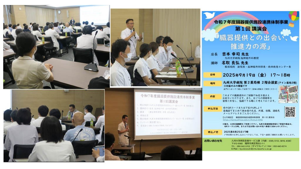 その一環として、9/19(金)第1回講演会では、講師を飯塚病院副院長・脳神経外科部長・救命救急センター長 名取良弘先生に『臓器提供との出会い、推進力の源』というテーマでのご講演をいただきました。また九州大学脳神経外科教授 吉本幸司先生に座長をつとめていただきました。本人、ご家族の意思や希望を尊重し、様々な取り組みを行われている名取先生をはじめ飯塚病院スタッフのみなさまに大変感銘を受けました。我々も一層精進してまいりたいと決意を新たにいたしました。
