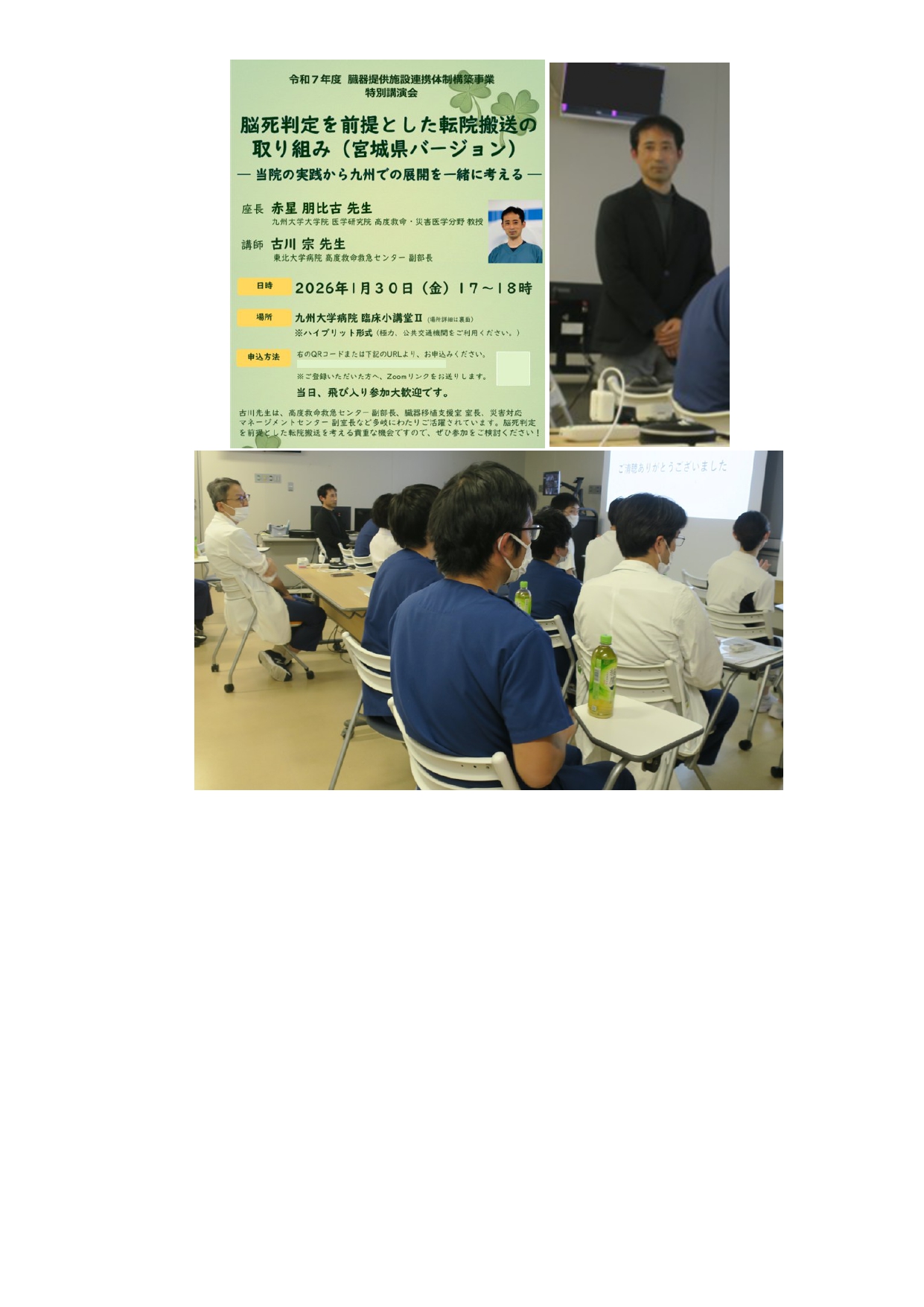 1/30(金)に、令和7年度臓器提供施設連携体制事業 特別講演会「脳死判定を前提とした転院搬送の取り組み(宮城県バージョン)― 当院の実践から九州での展開を一緒に考える」と題して、東北大学病院高度救命救急センターの古川宗先生にご講演いただきました。